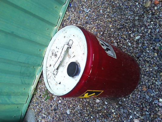Vintage oil barrel with cool period stickers